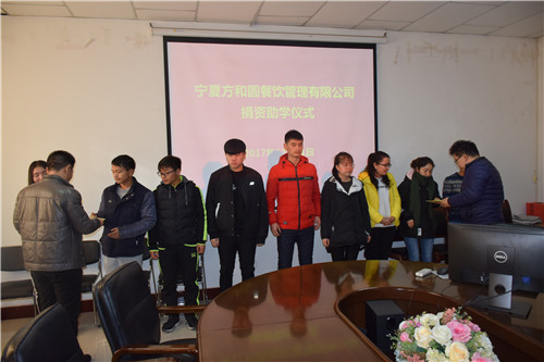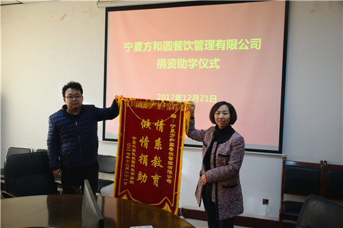 宁夏方和圆餐饮管理有限公司向学院20名受助学生发放了助学金。为表示对宁夏大学后勤集团与宁夏方和圆餐饮管理有限公司的感谢,学院特向宁夏方和圆餐饮管理有限公司赠送锦旗。受助学生代表王海云发言中向学院和学校后勤集团表示衷心的感谢,表示以后会刻苦学习,毕业后努力拼搏,为社会和国家做贡献。