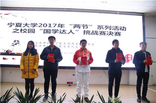 【宁夏大学新闻中心讯 人文学院 马小玲 马小蓉 马玲梅/文 刘晓欢/图】11月22日晚,由校团委主办、人文学院承办的宁夏大学2017"两节"系列活动之校园"国学达人"挑战赛决赛在贺兰山校区落幕。