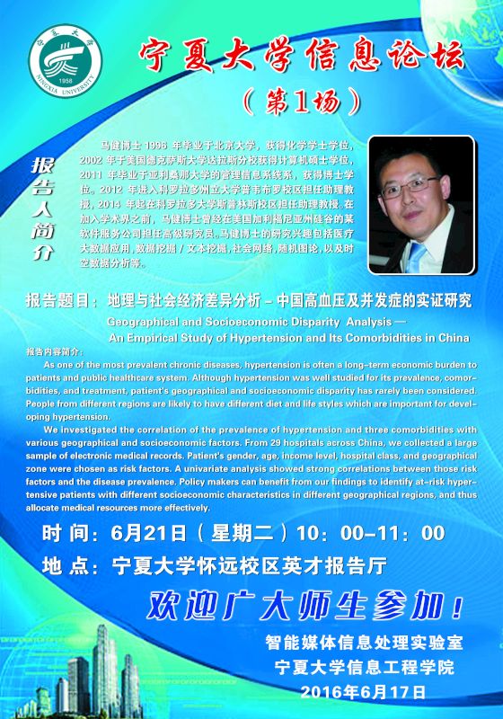 马健博士1996年毕业于北京大学,获得化学学士学位,2002年于美国德克萨斯大学达拉斯分校获得计算机硕士学位,2011年毕业于亚利桑那大学的管理信息系统系,获得博士学位。2012年进入科罗拉多州立大学普韦布罗校区担任助理教授,2014年起在科罗拉多大学斯普林斯校区担任助理教授。在加入学术界之前,马健博士曾经在美国加利福尼亚州硅谷的某软件服务公司担任高级研究员。马健博士的研究兴趣包括医疗大数据应用,数据挖掘/文本挖掘,社会网络,随机图论,以及时空数据分析等。