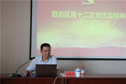 7月12日,校纪委书记周运生为政法学院教职工宣讲自治区第十二次党代会精神。